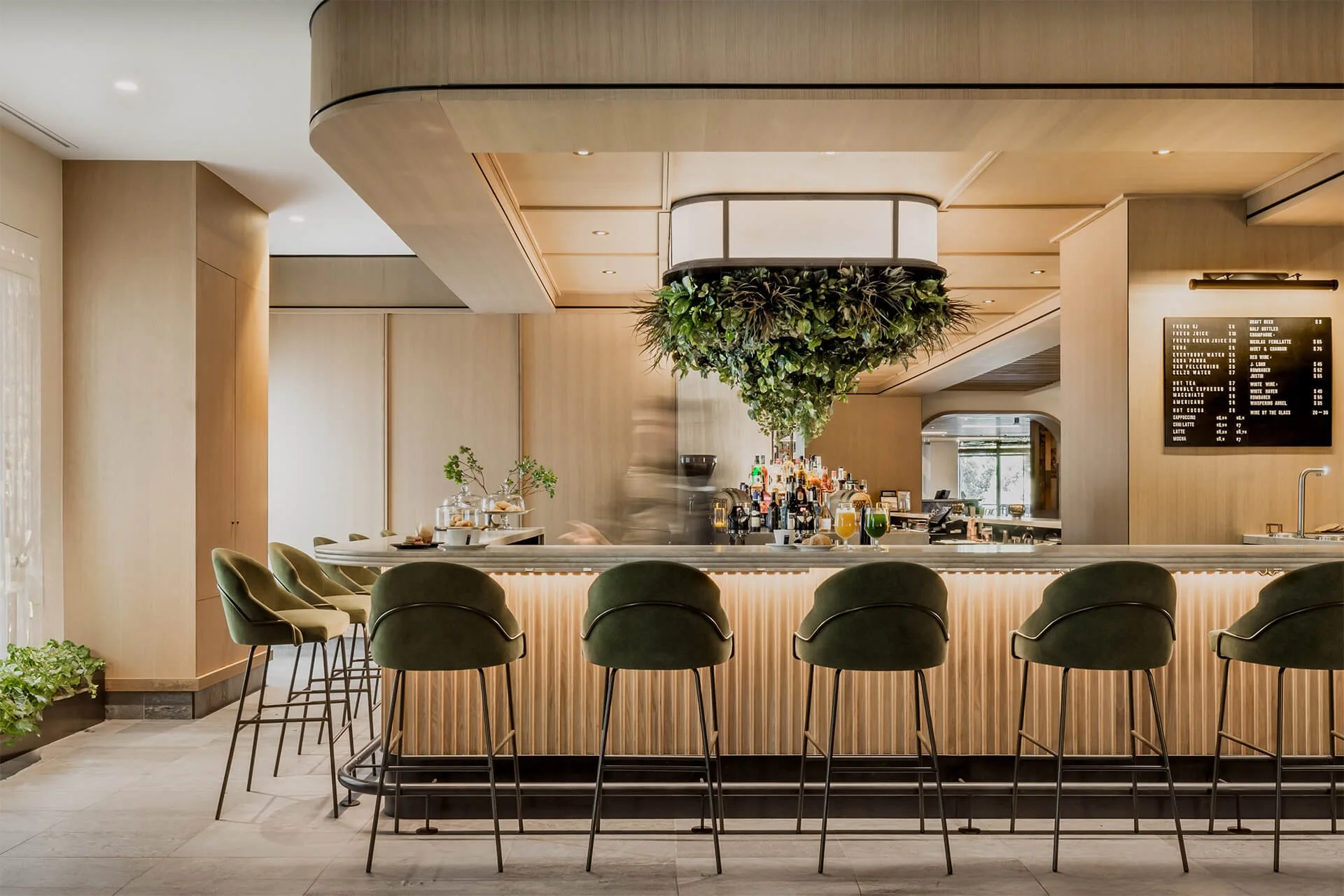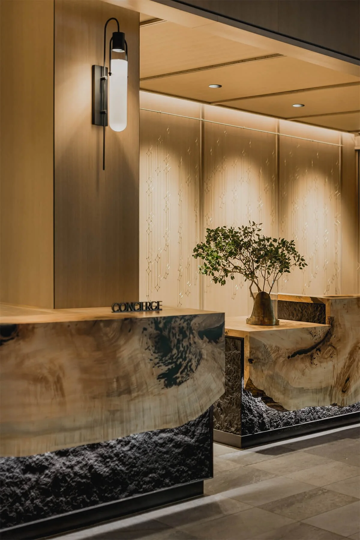 We worked directly with architecture and design firm, bld studio, and real estate developer, East West Partners, to reimagine the lobby of one of the most luxurious resorts in Aspen Snowmass - The Viceroy. Raw Creative provided design-assist, fabrication, and installation services throughout the space. Our scope included a completely custom concrete fireplace surround using black gfrc panels with an effect to mimic the look of basalt rock that is found in the region. This paneling is also seen on the lower portion of the live-edge front desk and as an accent to the wood coffee tables located in front of the fireplace. We also fabricated and installed the front desk with a singular live-edge wood slab that was engineered using barrel-making techniques to turn a complete corner. The textured gfrc panels can be seen glowing beneath. Raw Creative installed several custom white-oak built-ins throughout the space, including the entire build-out of their sales area. The wrap-around coffee and bar area was fabricated using a custom-made marble bar top with a tambour effect, a fluted base made of white oak, a metal kick-rail and soffit behind the bar made of interior lit fluted glass, and a steel cage that allows for hanging plants. This hanging steel cage serves a dual purpose as the staff can hang custom metal panels at the end of service to lock away liquor and other expensive items. This is an ongoing project, check back for more updates and fabrication throughout the space.